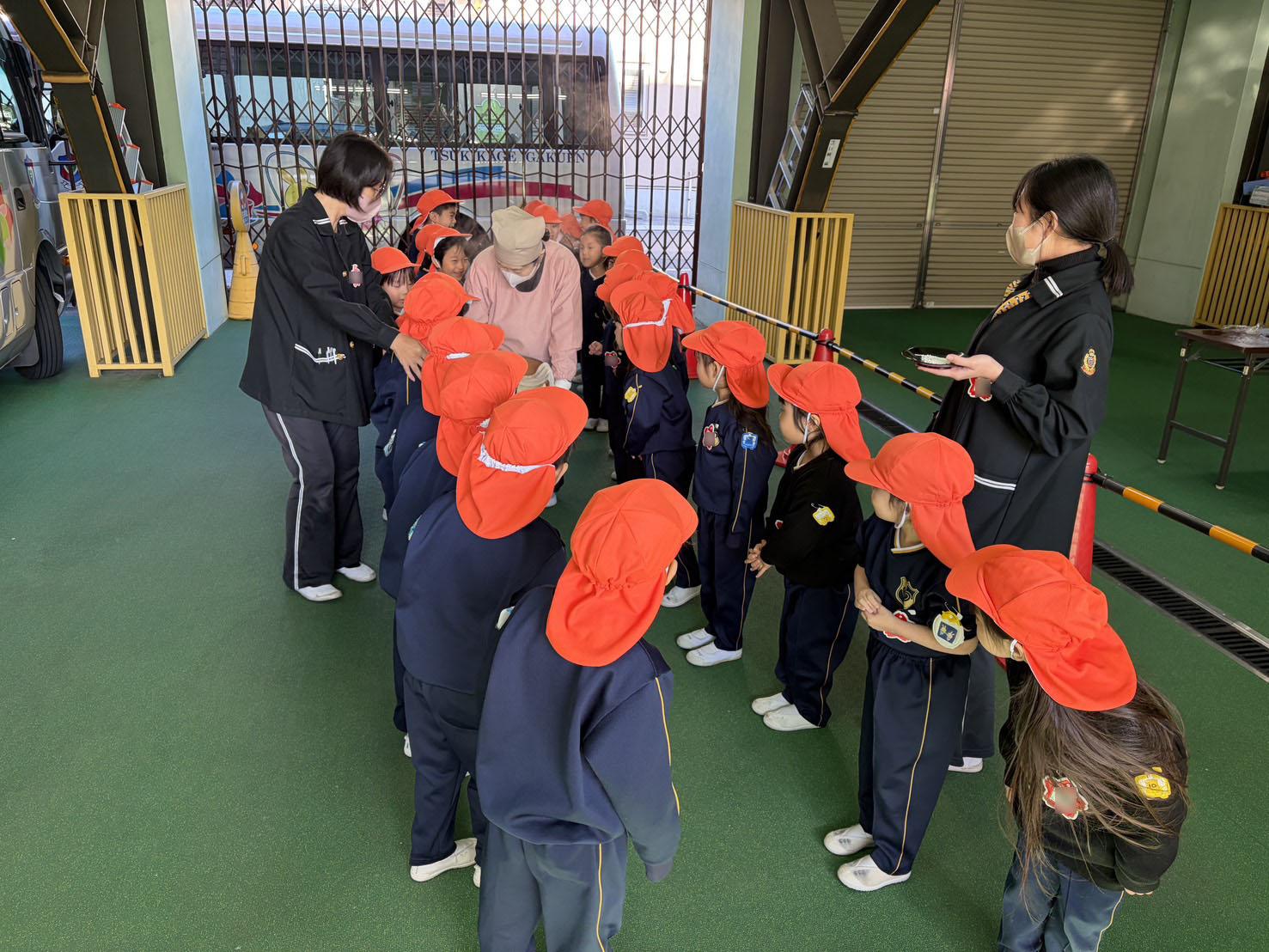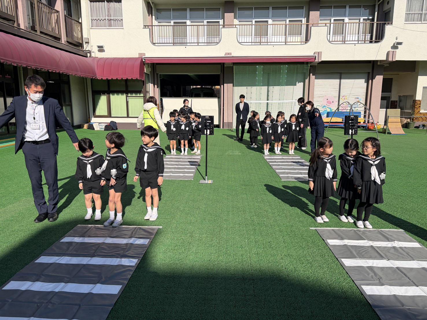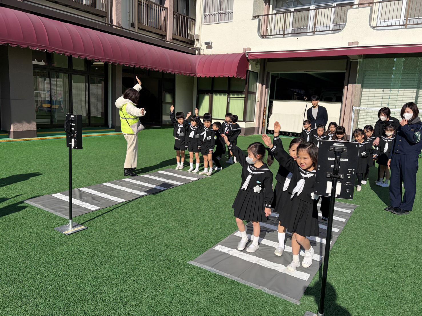 雪組(年長クラス)は園庭に作られた模擬の横断歩道を実際に渡る練習をしました。