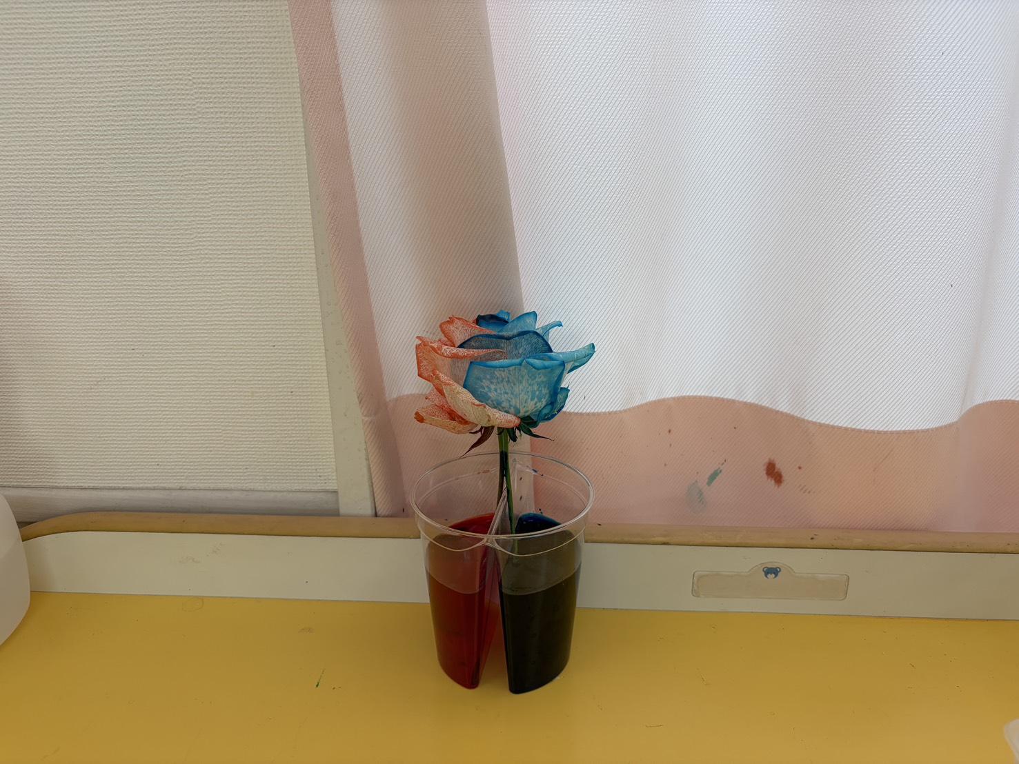 白いバラの茎に切り込みを入れ、それぞれの茎を赤と青の色水につけて観察します。